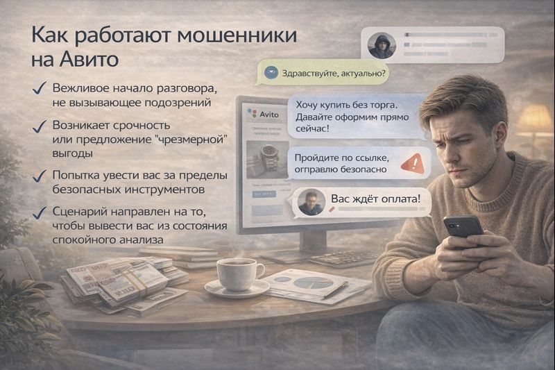 Очень часто разговор начинается безобидно. Вежливое приветствие, уточняющие вопросы, интерес к товару. Все выглядит нормально ровно до того момента, пока вас не пытаются увести за пределы безопасных инструментов Авито.