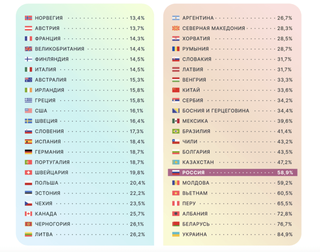 Если сравнивать пенсии в мире по покупательной способности, Россия находится значительно ниже стран Европы и Северной Америки. Средняя пенсия в России существенно уступает даже средним выплатам в Восточной Европе. При этом официальная средняя пенсия в России в 2026 году колеблется примерно в диапазоне 20 000–25 000 рублей, что в долларовом эквиваленте составляет около 220–280 долларов.