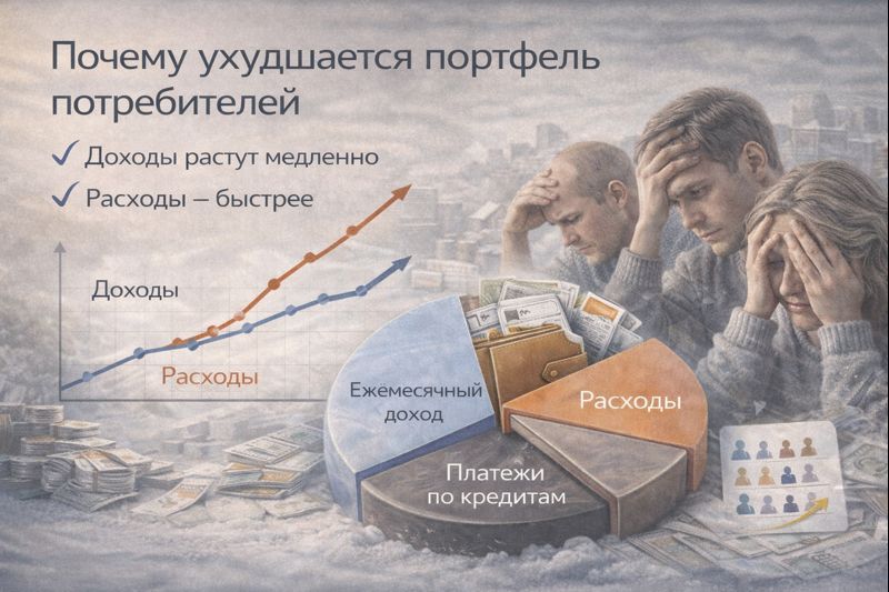 Портфель заемщиков меняется. В нем становится больше людей с нестабильным доходом, с уже существующими кредитами и минимальным запасом прочности. Любое колебание — рост цен, потеря части дохода, болезнь — сразу отражается на способности платить.
