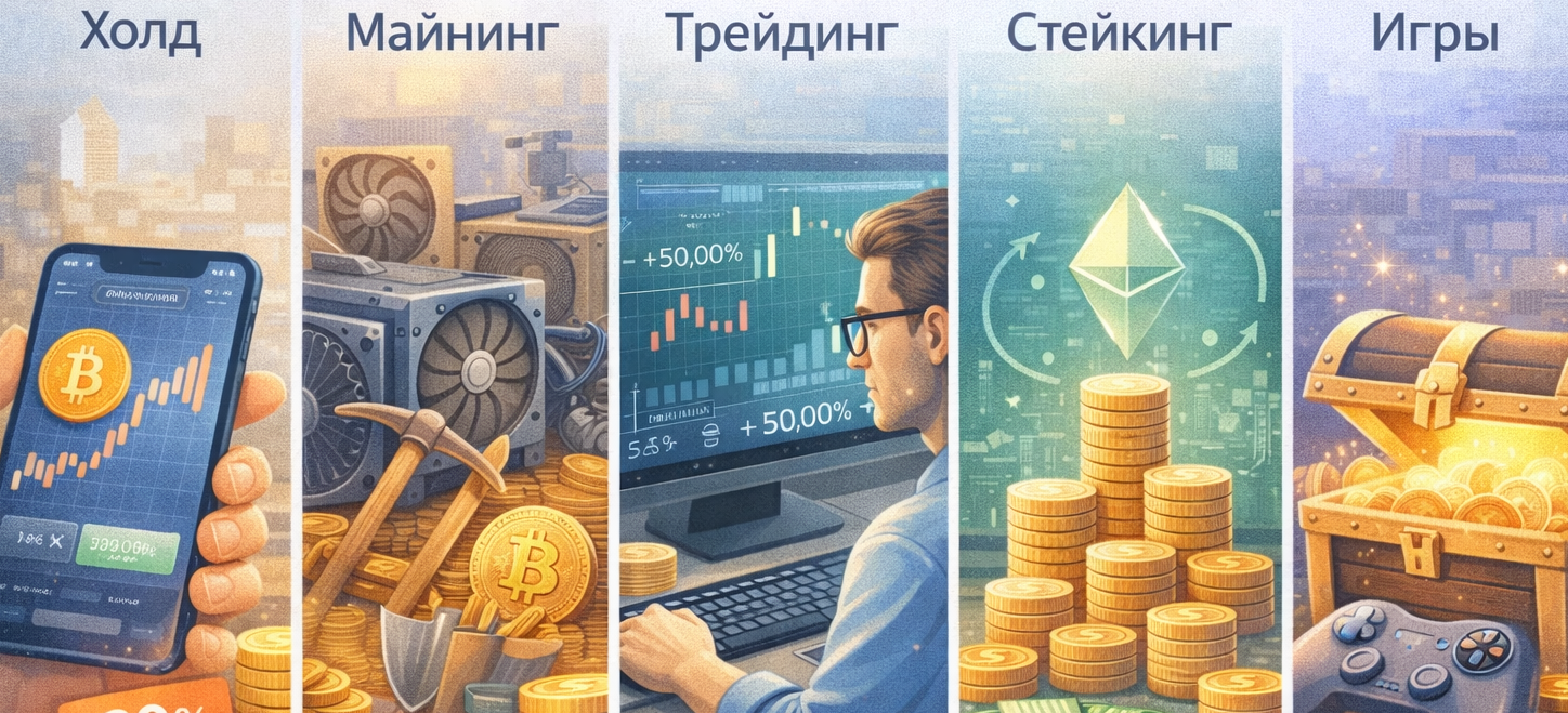 Долгосрочное удержание | Майнинг | Трейдинг | Стейкинг | Игры и метавселенные | Фарминг и ликвидность | Партнёрские программы | Создание контента